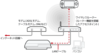 PS3™をLANケーブルでアクセスポイントに接続し、PSP™のワイヤレスLAN機能を使って、アクセスポイント経由でPS3™に接続します。