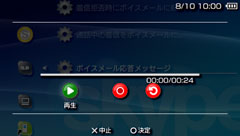 [ボイスメール応答メッセージ]を選ぶと、自分で応答メッセージを録音できます。このとき、音声を認識させるためにPSP™に対応した音声入力機器が接続されている必要があります。