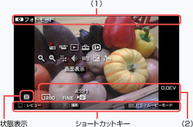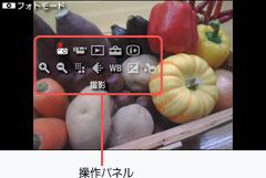 ボタンを押すと、操作パネルが表示されます。フォトモード、ムービーモード、レビュー中では、表示される項目が異なります。また、お使いのカメラによっても、表示される項目が異なります。