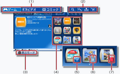 (PlayStation®Store)は、PSP™で利用できるゲームやゲームの追加アイテム、映像コンテンツなどをダウンロード(購入)できるPlayStation®Network上のオンラインショップです。