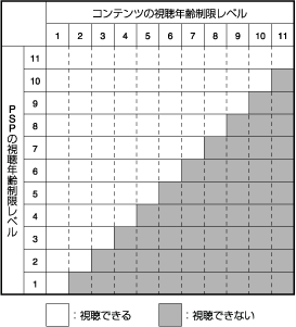 PSP™の視聴年齢制限レベルとコンテンツの視聴年齢制限レベルの組み合わせで、視聴できる/できないが決まります。組み合わせは次の表のとおりです。