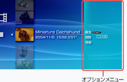 ボタンを押すと、オプションメニューが表示されます。情報を見たり、動画ファイルを削除したりできます。表示されるオプション項目は、選んだアイコンによって異なります。