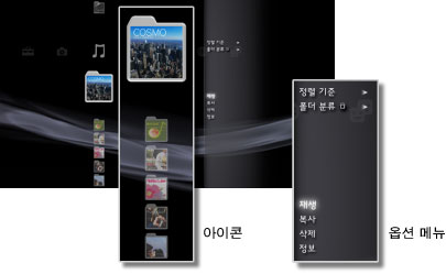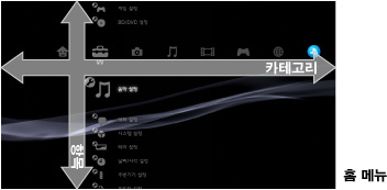 PS3™에는 XMB™(크로스 미디어 바)라는 유저 인터페이스가 탑재되어 있습니다. 가로 행에는 기능이 카테고리로 표시되고 세로 열에는 각 카테고리에서 수행할 수 있는 항목이 표시됩니다.