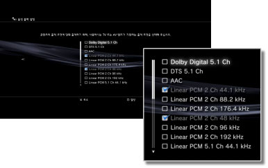 (사운드 설정) > [음성 동시 출력]을 [켜기]로 설정해 주십시오. - 5단계에서 [Linear PCM 2 Ch 88.2 kHz] 또는 [Linear PCM 2 Ch 176.4 kHz]를 선택하면 오디오 기기에 따라서는 소리가 끊어지거나 나오지 않는 경우가 있습니다.