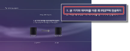 2대의 PS3™를, 전원을 끈 상태에서 작업을 시작해 주십시오. 이 기능을 사용하여 전송할 수 있는 데이터는 전송 받을 PS3™에 복사됩니다. 복사가 금지된 게임 저장 데이터 및 저작권이 보호된 콘텐츠 등은 이동됩니다.