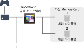 가상 Memory Card는 하나의 소프트웨어에 대해 두 개가 작성됩니다.(MEMORY CARD 슬롯 1, 2용) 가상 Memory Card는 PlayStation®Store에서 PlayStation® 규격 소프트웨어를 다운로드했을 때 자동으로 만들어지고 PlayStation® 규격 소프트웨어 타이틀과 같은 이름으로 저장됩니다.