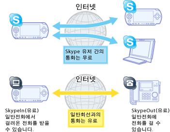 Skype는 인터넷을 통해 무료로 전화를 걸 수 있는 소프트웨어입니다. 무선 인터넷 접속이 필요합니다. Skype 소프트웨어로 일반・휴대 전화와 통화하는 경우는 유료이지만 Skype 유저 간의 통화는 무료로 이용할 수 있고 해외로 전화를 하는 경우에도 요금이 발생하지 않습니다. PSP™의 Skype에는 다음과 같은 기능이 있습니다.