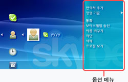 | 통화 | 연락처에 전화하기 Skype 아이디 이외에 전화 번호가 등록되어 있는 경우에는 목록이 표시되고 상대의 Skype 아이디 또는 전화번호를 선택할 수 있습니다. |