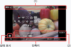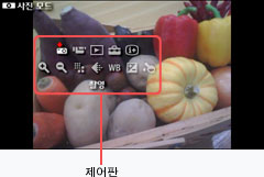 버튼을 누르면 제어판이 표시됩니다. 사진 모드, 동영상 모드 및 리뷰중에는 표시되는 항목이 다릅니다. 또한 사용하시는 카메라에 따라서도 표시되는 항목이 다릅니다.
