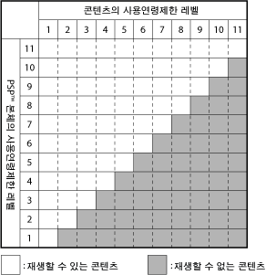 PSP™의 사용연령제한 레벨과 콘텐츠의 사용연령제한 레벨의 조합으로 콘텐츠 재생여부가 결정됩니다. 조합에 대한 상세한 사항은 다음 표를 참조해 주십시오.