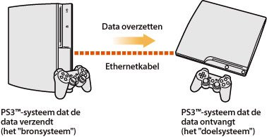 U kunt nu data overzetten (kopiëren of verplaatsen) die opgeslagen zijn in de systeemopslag van een PS3™-systeem naar de systeemopslag van een ander PS3™-systeem via een ethernetkabel.