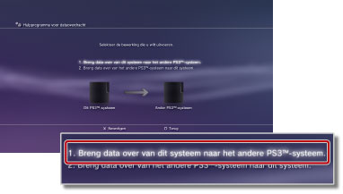 - Wanneer u deze handeling uitvoert, worden alle data gewist die opgeslagen zijn op het PS3™-systeem dat de data ontvangt (het "doelsysteem").