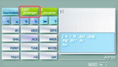 Als de invoermodus op snelkoppelingen naar webadressen is ingesteld, kunnen vaak gebruikte tekengroepen zoals [http://] en [.com] worden geselecteerd om het invoeren te vergemakkelijken. U kunt ook eerder ingevoerde adressen weergeven door op de toets [Geschiedenis] te drukken. U kunt met de SELECT-toets de invoermodi doorlopen.