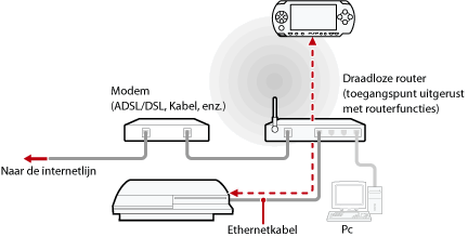 Sluit het PS3™-systeem op een toegangspunt aan via een netwerkkabel en gebruik vervolgens de functie draadloos LAN van het PSP™-systeem om een verbinding tot stand te brengen met het PS3™-systeem via het toegangspunt.