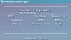 De optie [Automatisch] kan beschikbaar zijn afhankelijk van het model van het PSP™-systeem dat u gebruikt. Selecteer [Automatisch] wanneer u een toegangspunt gebruikt dat automatische setup ondersteunt. Als u de instructies op het scherm volgt, worden de nodige instellingen automatisch voltooid. Neem contact op met uw lokale handelaar voor informatie over toegangspunten die automatische setup ondersteunen.