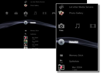 Digitalkamera | Vis bildefiler som er lagret på et digitalkamera som er kompatibelt med PS3™-systemet. |