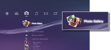 O Photo Gallery é um aplicativo que melhora a experiência de visualização das fotos gravadas no sistema PS3™. Você pode agrupar as fotos de várias maneiras, como pela data e hora, por evento ou pela quantidade de pessoas nas fotos. Você também pode criar uma lista de reprodução das fotos selecionadas e selecionar uma moldura para a lista de reprodução. Para detalhes sobre como utilizar o Photo Gallery, selecione aqui.