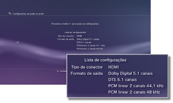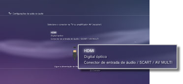 - Quando utilizar um cabo HDMI, apenas o áudio [PCM linear 2 canais] será reproduzido do software de formato PlayStation®2 e PlayStation®. Para reproduzir áudio Dolby Digital ou DTS®, você deve conectar o sistema PS3™ e o dispositivo de áudio utilizando um cabo óptico digital e alterar para [Digital óptico] em [Configurações de saída de áudio].