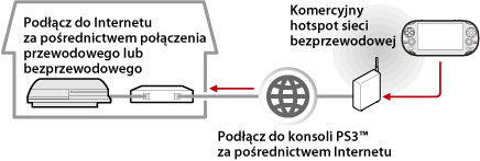 Przy użyciu urządzenia obsługującego funkcję gry zdalnej, takiego jak system PS Vita lub PSP™ i bezprzewodowego punktu dostępowego można nawiązać połączenie z systemem PS3™ przez Internet. Aby móc korzystać z funkcji gry zdalnej, w systemie PS3™ należy włączyć tryb czuwania dla połączenia funkcji gry zdalnej.