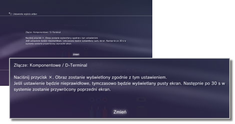 - Jeśli ustawienia wyjścia wideo nie są odpowiednie dla używanego telewizora, po zmianie rozdzielczości na ekranie może wystąpić brak obrazu. Po chwili pierwotna rozdzielczość ekranu powinna zostać jednak przywrócona. Jeśli brak obrazu na ekranie potrwa dłużej niż 30 sekund, należy wyłączyć konsolę. Następnie przez co najmniej pięć sekund należy przytrzymać przycisk zasilania znajdujący się w przedniej części konsoli, aby ją ponownie włączyć. W ustawieniach wyjścia wideo automatycznie zostanie przywrócona standardowa rozdzielczość.
