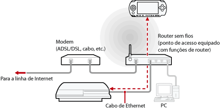 Ligue o sistema PS3™ a um ponto de acesso utilizando um cabo de rede e utilize a função de LAN sem fios do sistema PSP™ para ligar ao sistema PS3™ através do ponto de acesso.