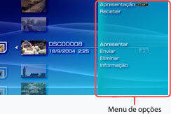 Seleccione um ícone e prima o botão para apresentar o menu de opções. As opções do menu variam consoante o ícone seleccionado.