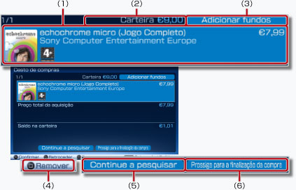 - Se seleccionar [Comprar agora] para um item no passo 3, pode passar a página do cesto de compras e prosseguir directamente para o ecrã de confirmação da compra (passo 6). Se tiver as informações do cartão de crédito registadas na sua conta PlayStation®Network, os fundos são adicionados automaticamente quando a carteira não tem fundos suficientes para finalizar a compra.