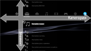 Пользовательский интерфейс системы PS3™ называется XMB™ (XrossMediaBar). B горизонтальном ряду отображаются функции и категории системы, а в вертикальной колонке отображаются элементы, которые могут быть использованы в любой категории.