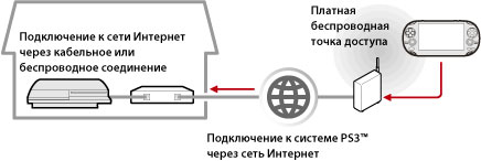 С помощью устройства с поддержкой дистанционного воспроизведения, такого как система PS Vita или система PSP™, и беспроводной точки доступа можно подключиться к системе PS3™ через Интернет. Дистанционное воспроизведение возможно только в том случае, если система PS3™ работает в режиме ожидания соединения для дистанционного воспроизведения.