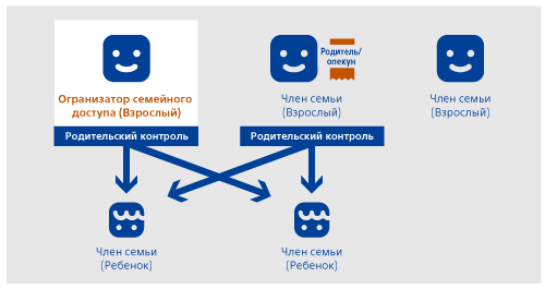 Родитель или опекун может задавать настройки родительского контроля. Организатор семейного доступа может назначить другого взрослого члена семьи родителем или опекуном. - Члены семьи