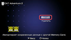 Сохраненные данные можно импортировать с другой внутренней Memory Card на внутреннюю Memory Card с используемой в настоящий момент игрой. Импортированные на внутреннюю Memory Card данные можно удалить. Подробнее о внутренних Memory Card см. в разделе