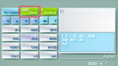 Если для режима ввода установлено значение гиперссылки веб-адресов, чтобы упростить ввод, можно выбрать часто используемые группы символов, такие как [http://] и [.com]. Чтобы отобразить адреса, вводившиеся ранее, нажмите клавишу [История]. Можно переключать режимы ввода с помощью кнопки SELECT.