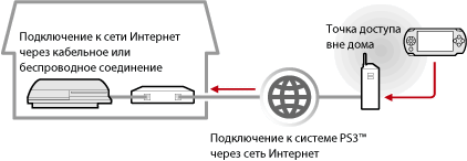 Подключите систему PSP™ к домашней системе PS3™ через Интернет и точку доступа ("горячую" точку) беспроводной сети общего пользования. После установки системы PS3™ в режим ожидания подключения функцию дистанционного воспроизведения можно использовать, даже находясь за границей.