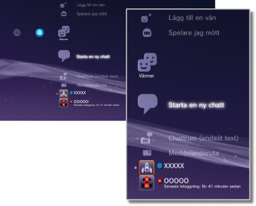 Du kan skicka eller ta emot meddelanden eller chatta med andra PS3™-användare över nätverket PSNSM. För att kunna använda de här funktionerna måste du skapa (registrera dig för) ett Sony Entertainment Network-konto. Följande ikoner visas under