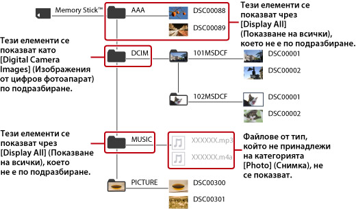 По подразбиране се показва съдържанието, записано на ниво коренна директория, на устройство за съхранение на данни или USB устройства за съхранение на данни.