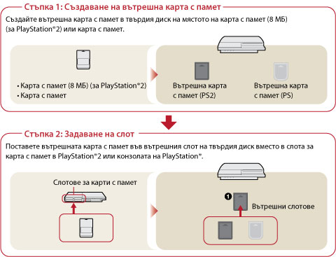 Записаните данни във формат за софтуер за PlayStation®2 или софтуер във формат за PlayStation® са записани на вътрешни карти с памет на твърдия диск. Вътрешните карти с памет могат да бъдат използвани като бъдат задавани на слотове, след като са създадени. Данните се показват в