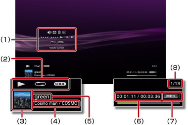 Преглед на състоянието и друга информация по време на възпроизвеждане. Елементите на информацията са различни, в зависимост от възпроизвежданото съдържание.