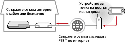 Със системата PSP™ и безжична точка на достъп (напр. “гореща точка” или търговска услуга) можете да сер свържете със системата PS3™, която се намира у вас по интернет. За да играете дистанционно, когато не сте вкъщи, системата PS3™ трябва да е настроена в режим за игра от разстояние.