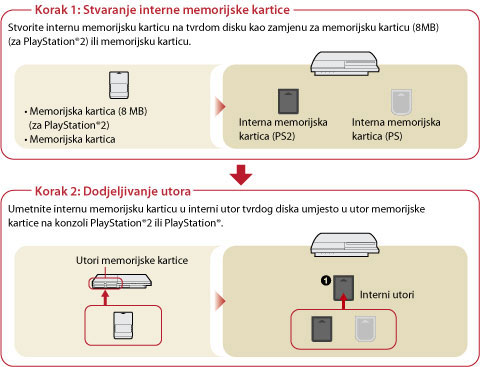 Spremljeni podaci za softver PlayStation®2 ili PlayStation® formata spremljeni su na interne memorijske kartice stvorene unutar tvrdog diska. Interne memorijske kartice mogu se koristiti dodjeljivanjem utora nakon stvaranja. Podaci se prikazuju u dijelu (Memory Card Utility (PS / PS2)).