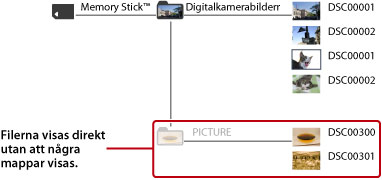 Innehåll som sparats i följande mappar på rotkatalognivå på lagringsmedia eller USB-minnen visas som standard.