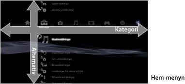 PS3™-systemet har ett användargränssnitt som kallas XMB™ (XrossMediaBar). På den vågräta raden syns systemfunktioner i kategorier, och i den lodräta kolumnen visas vilka funktioner som kan utföras i varje kategori. Huvudskärmen för XMB™ kallas "Hem-menyn".